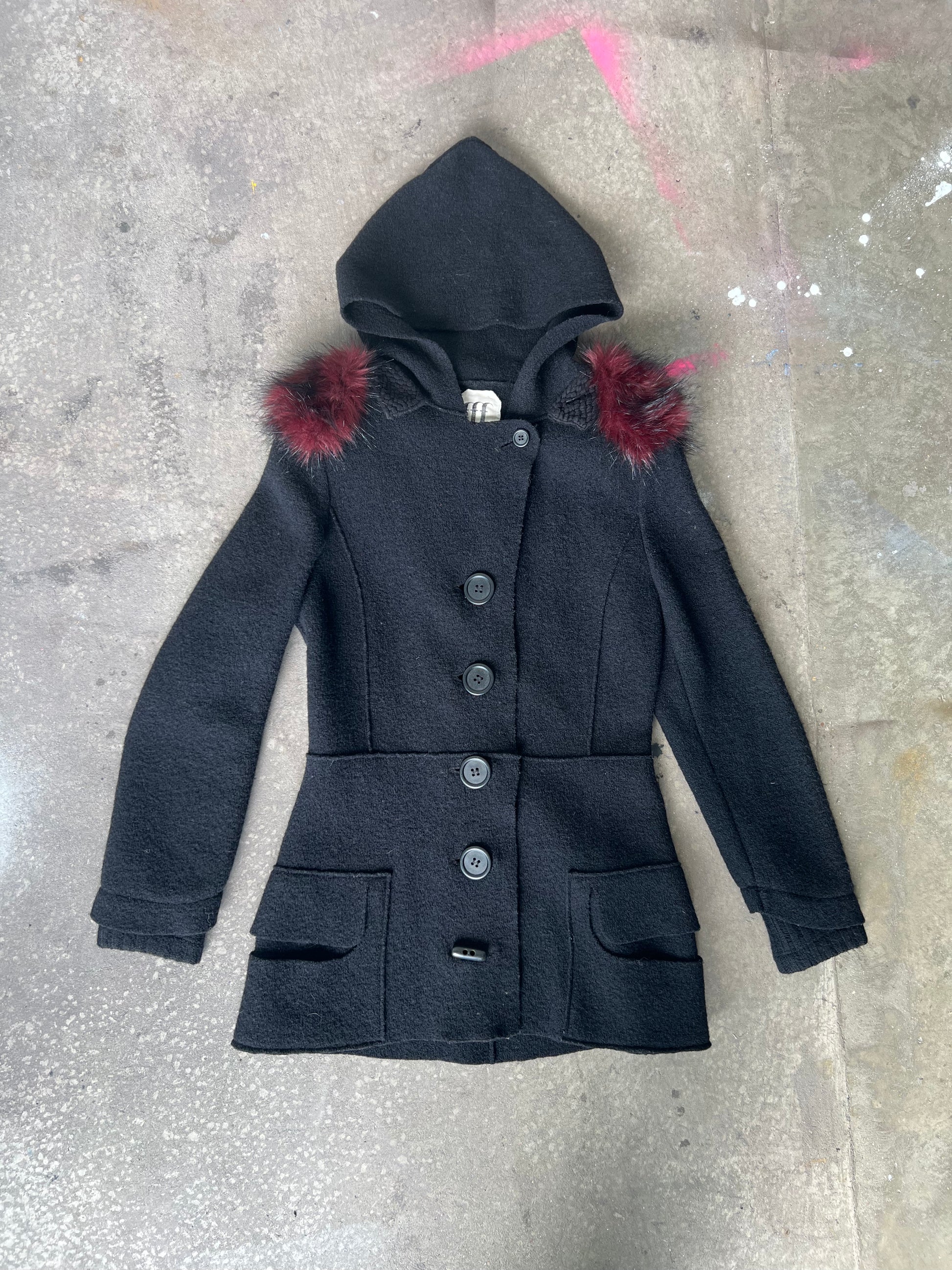 100% black wool with faux fur shoulder pads and braided jersey fringe back piece.