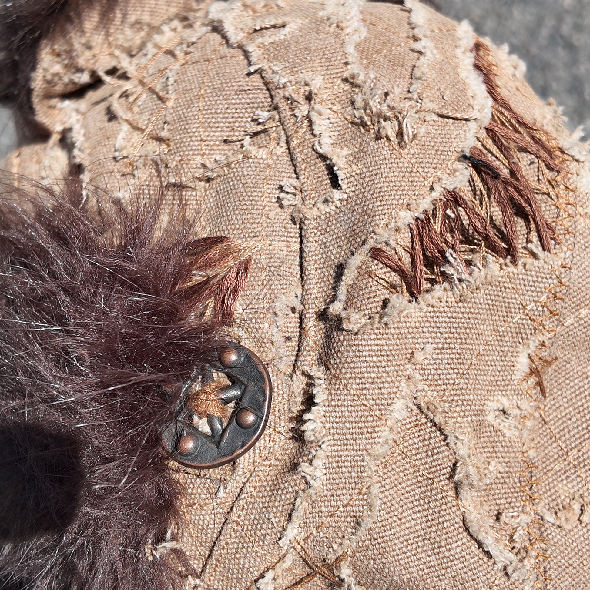 A heavy ,brown, duck canvas trapper hat. With high quality brown faux fur and two tone decorative hand stitching details. Lined with a tartan blanket and finished with a quick release metal buckle under the chin.