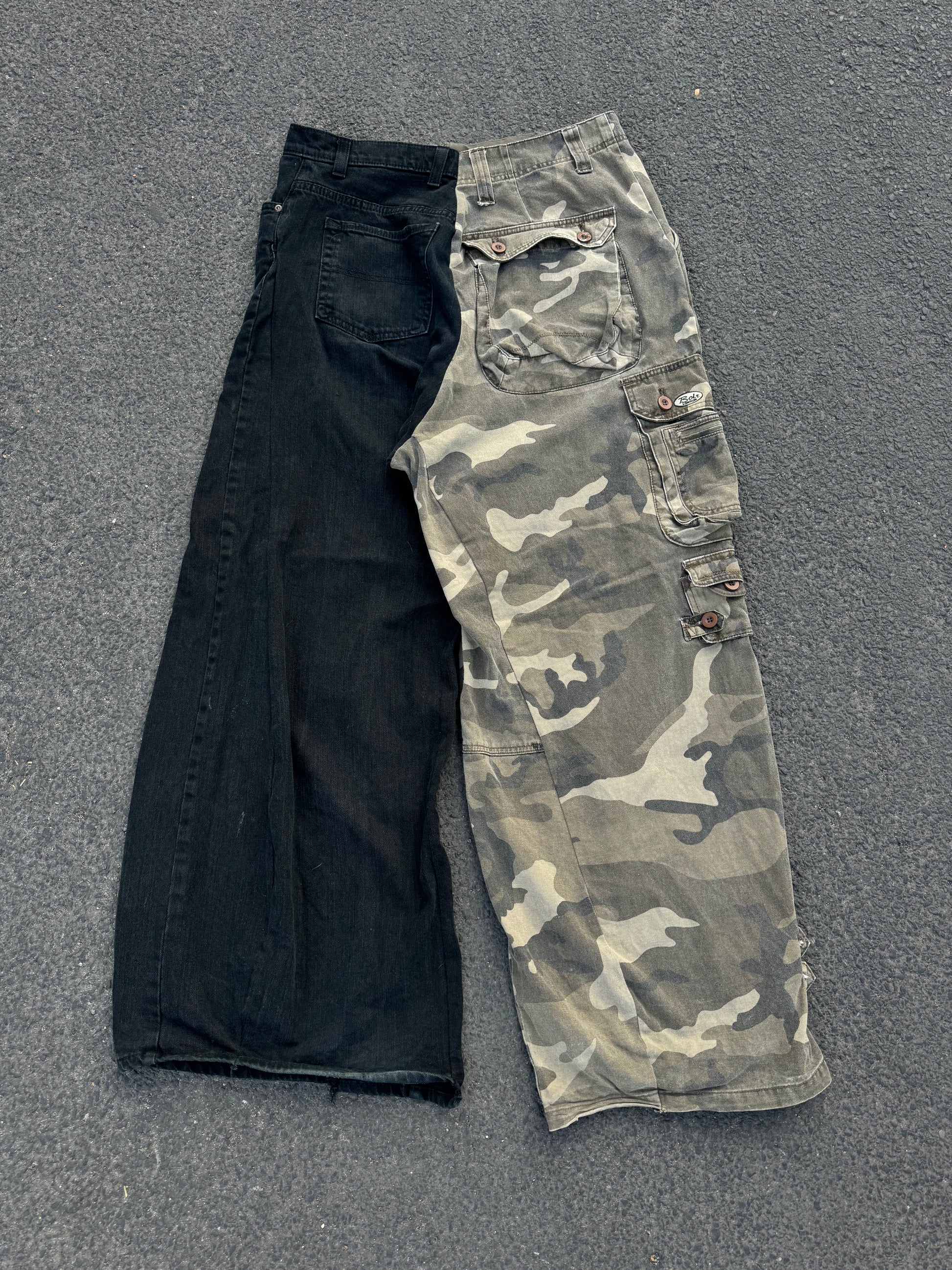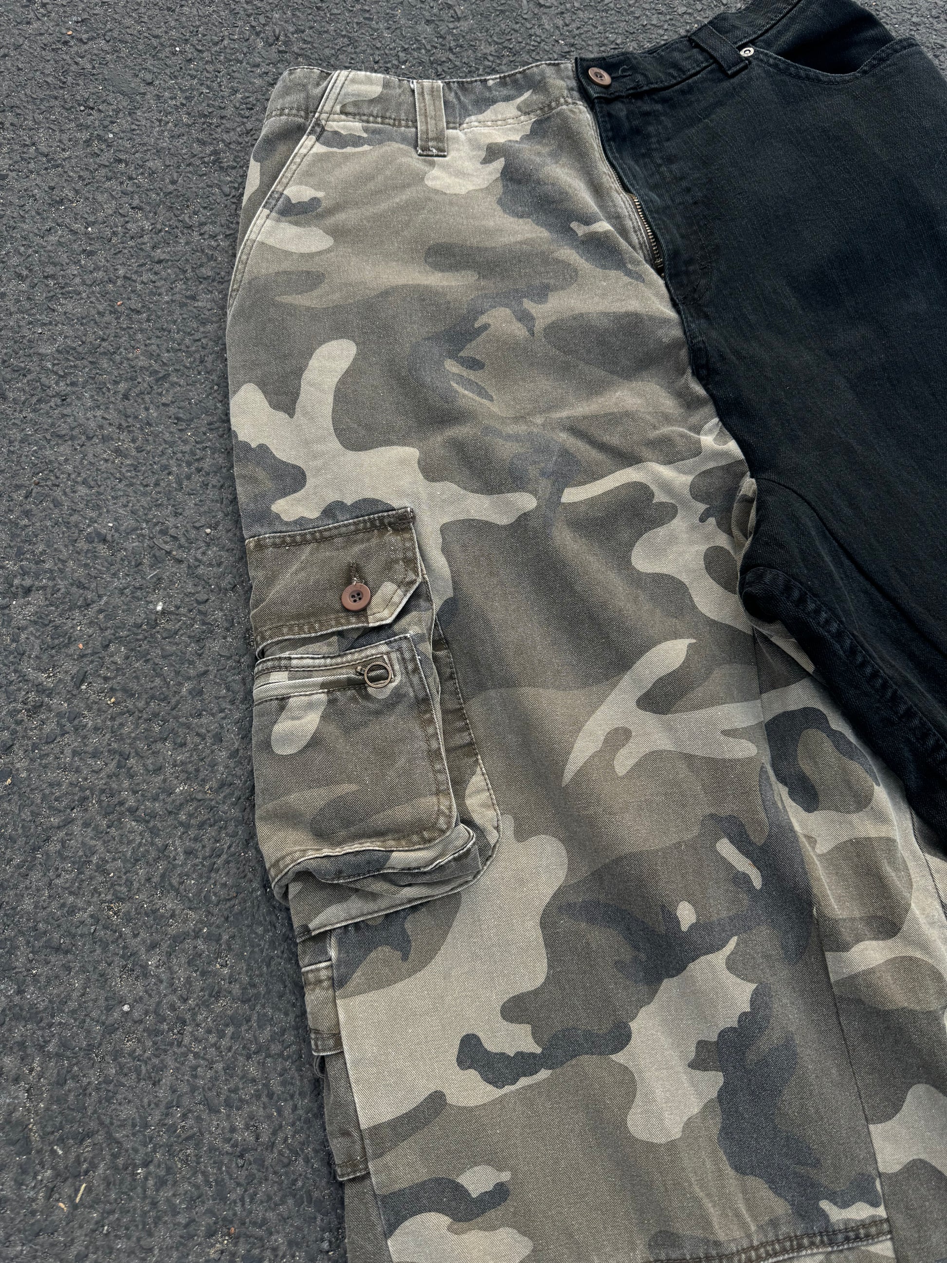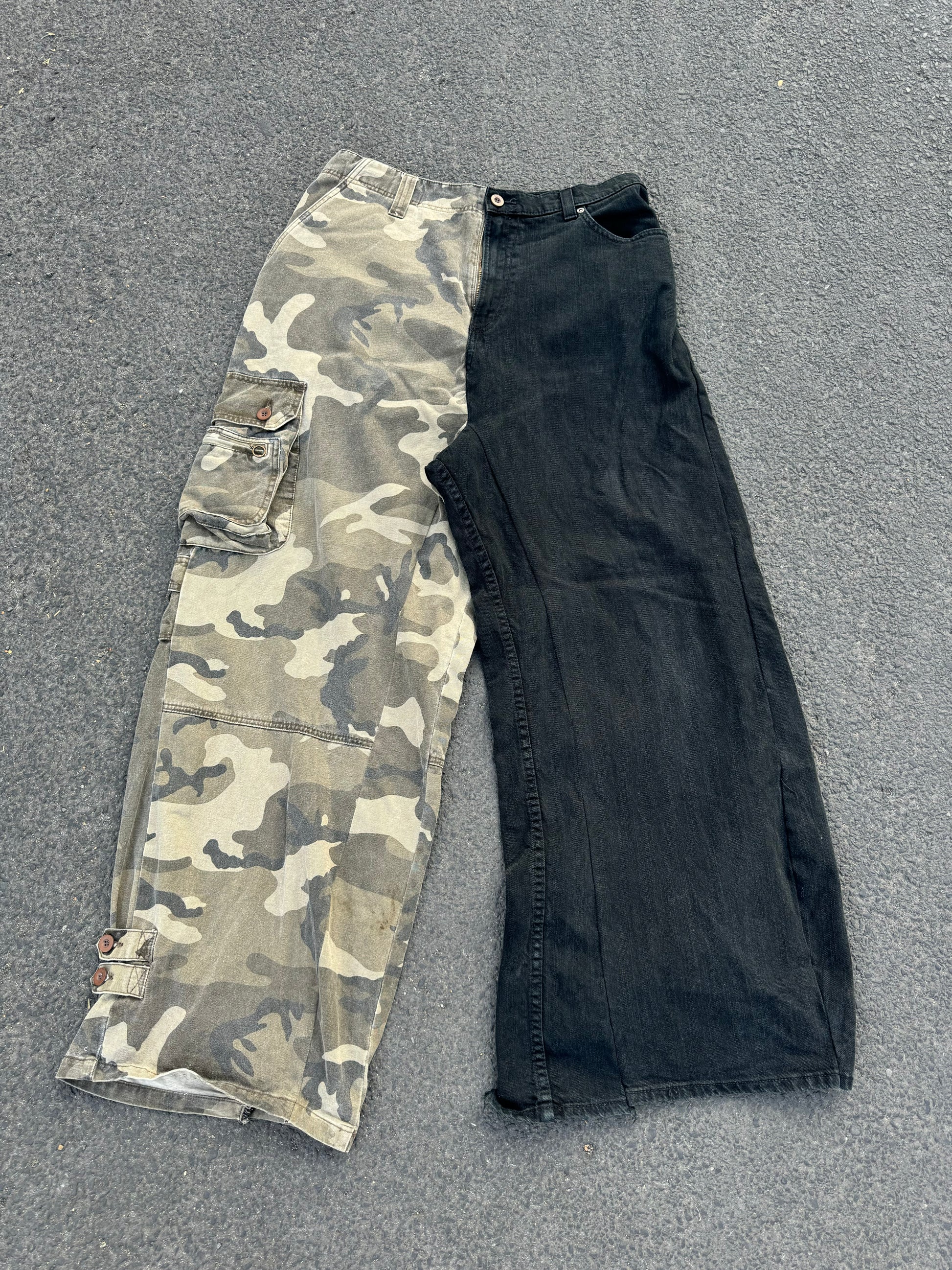 This is a reworked jean made out of half camo denim and half black denim.