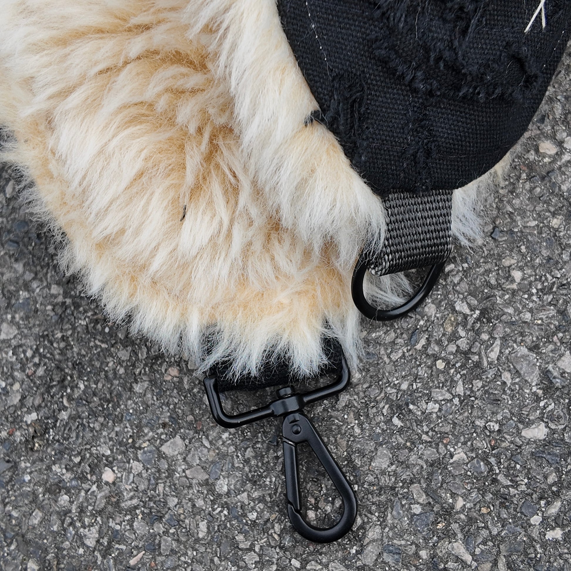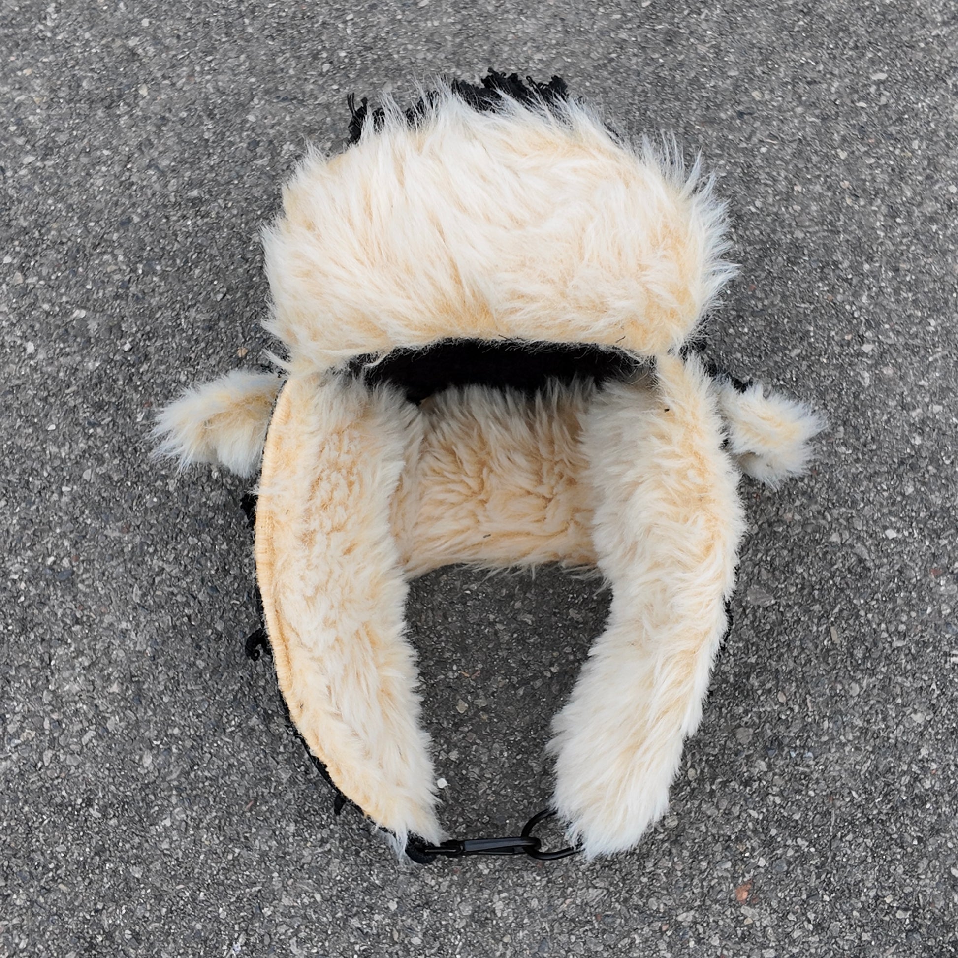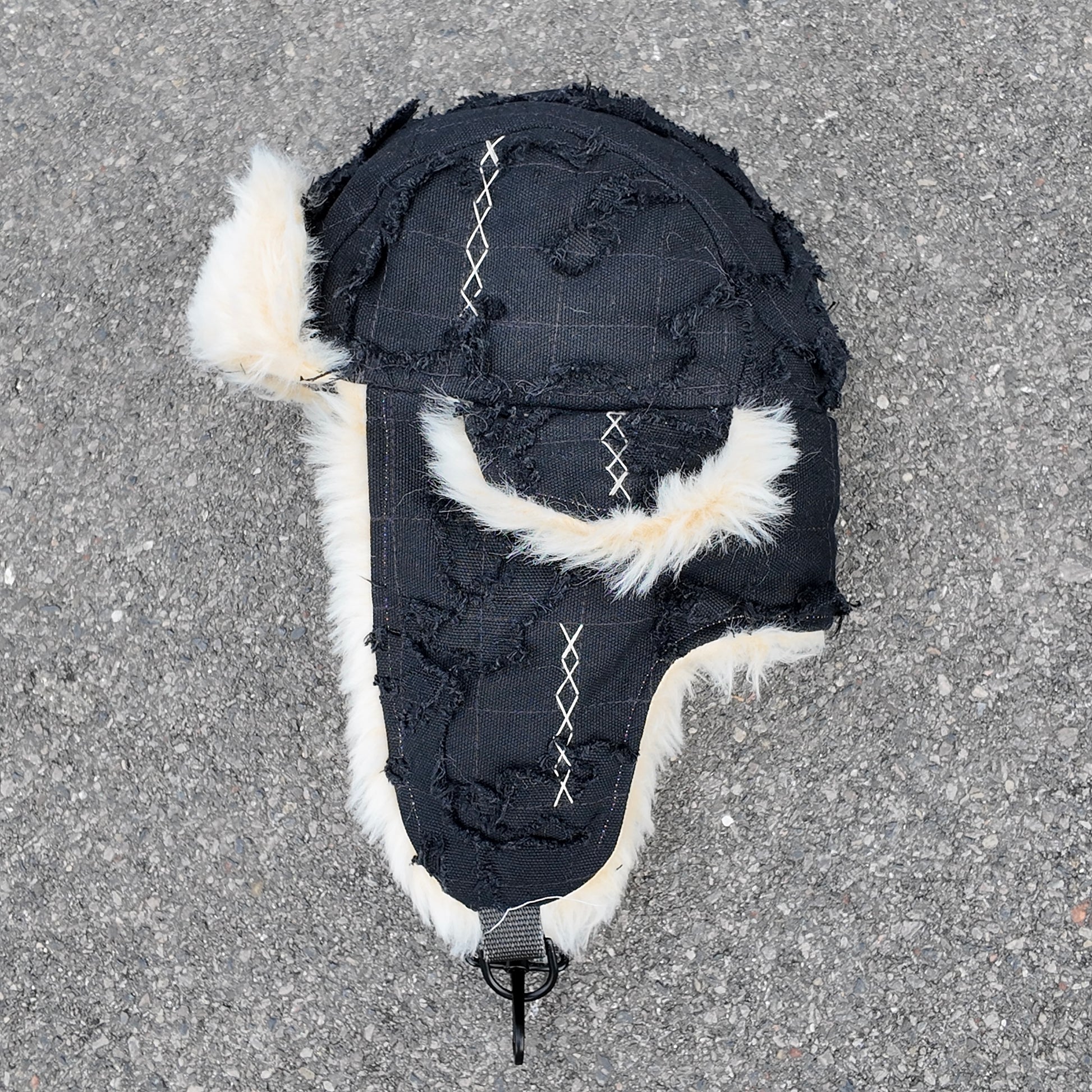 A double layered heavy canvas trapper hat. Distressed layered and repaired to create the unique texture. In a contrasting black and white colourway with premium faux fur material and decorative hand stitching.