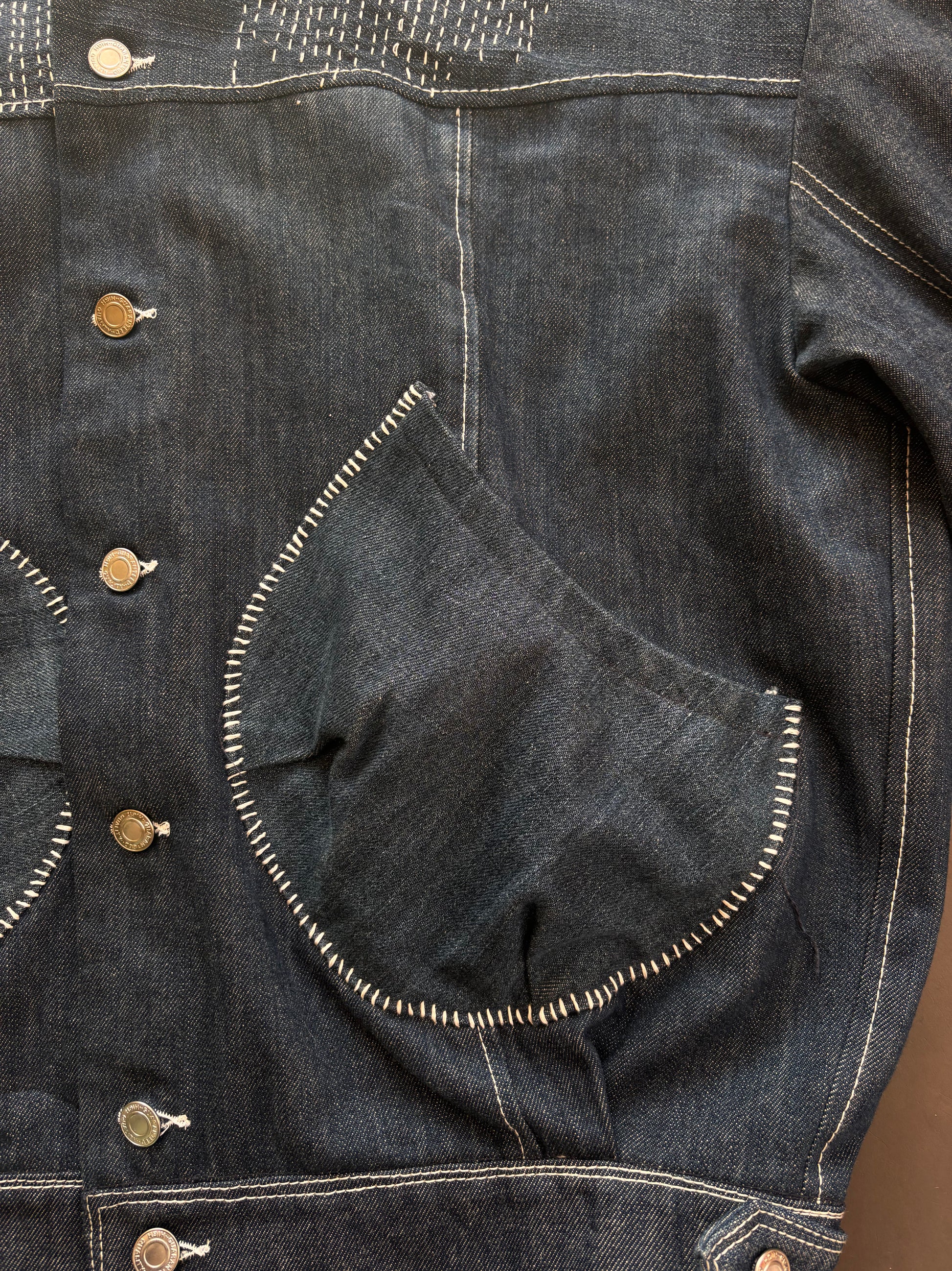 Denim jacket crafted from upcycle jeans and mended by hand with sashiko stitching and darning techniques